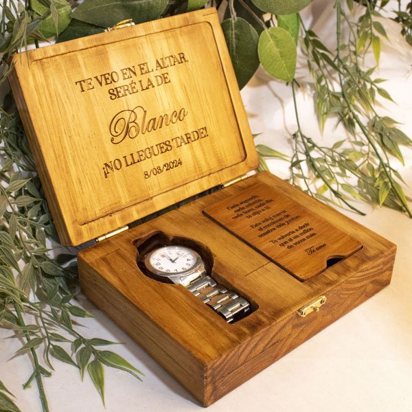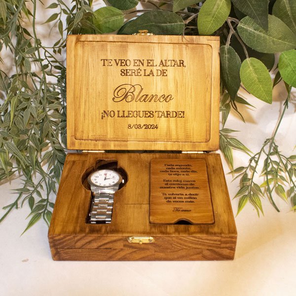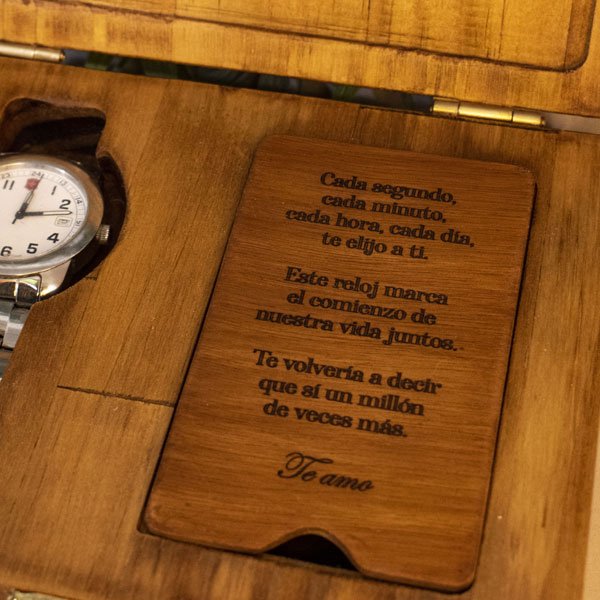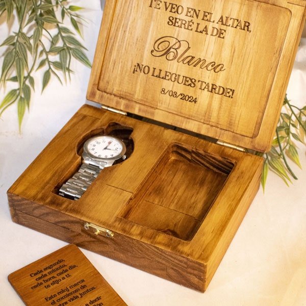 Caja de Madera Personalizada para Reloj de Compromiso en MDF – Una pieza artesanal que captura la esencia del trabajo manual colombiano. Cada producto es único, elaborado con dedicación y pasión por nuestros artesanos locales. Incluye personalización con nombre, fecha o diseño especial. Esta creación es perfecta para añadir un toque de elegancia rústica a tu hogar. Su diseño versátil se adapta a cualquier estilo de decoración, desde lo tradicional hasta lo moderno. Lleva un pedazo de Colombia a tu hogar con esta hermosa artesanía.